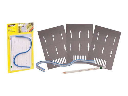 Startsæt til vejmarkering inkluderer: 1 kurvelineal, 1 vejmærkepen, 1 vejmarkeringsstencil hver til H0, TT, N-gauge (Varenr. 60740)