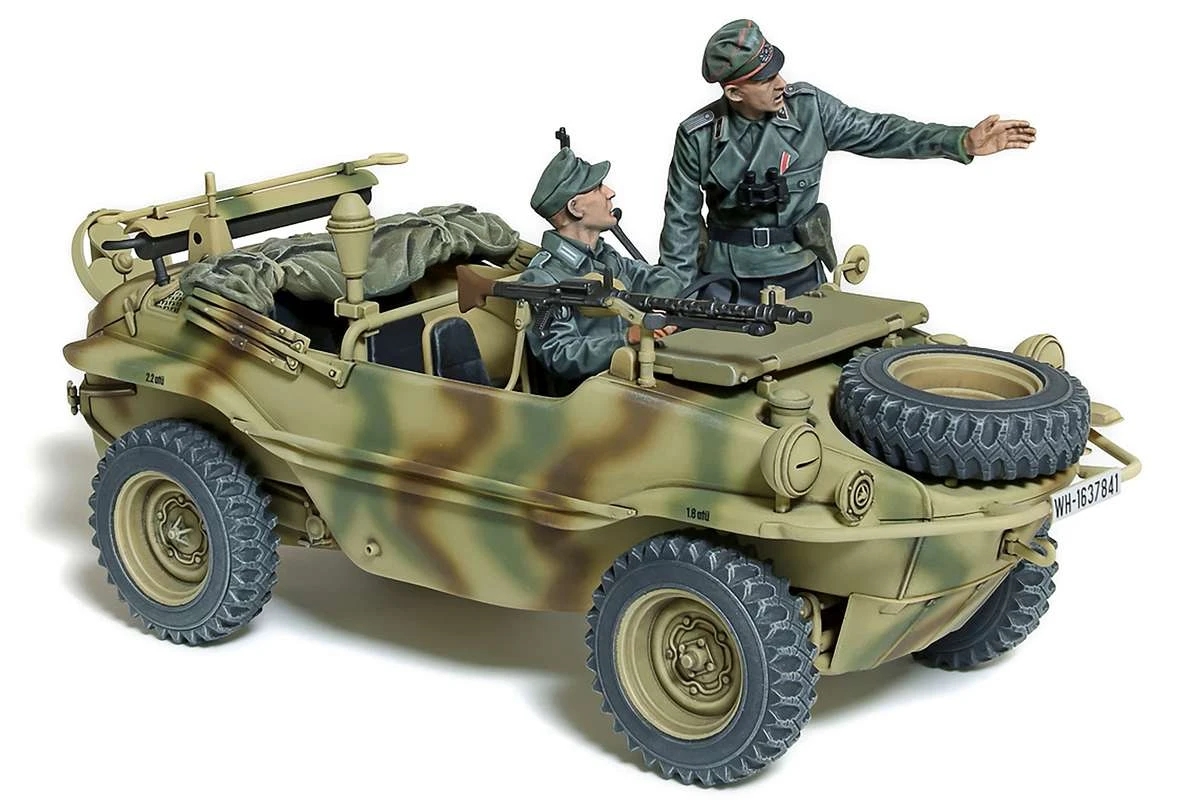 Nu er vi glade for at byde velkommen til lanceringen af et Schwimmwagen-kit med brede dæk, ekstra udstyr som MG34 maskingevær og nye to-figurers modeller. Krydset af floder og prydet med vådområder udgør europæisk geografi betydelige militære udfordringer og førte til, at den tyske Wehrmacht udviklede Schwimmwagen, et amfibiekøretøj baseret på Kübelwagen, designet af Ferdinand Porsche. Med en 4-cylindret benzinmotor med 25 hk havde Schwimmwagen en topfart på 80 km/t på jorden.